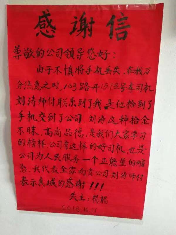2.10月17日,103路駕駛員劉濤拾到一部OPPO手機,細心的他按照電話里的信息聯(lián)系到了失主,由于失主在公交車上丟了手機,真沒報任何希望,司機拾到手機并主動聯(lián)系失主這一行為,深深的打動了這位叫楊楊的女士,于是她親手寫了一封表揚信交到路隊,她說:劉濤師傅的高尚品德,正是公交人為乘客服務(wù)正能量的一個縮影。