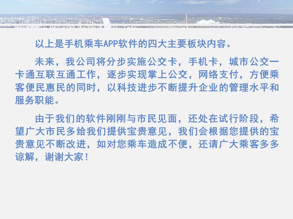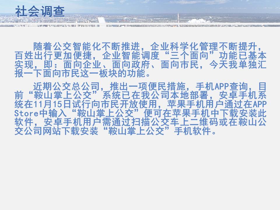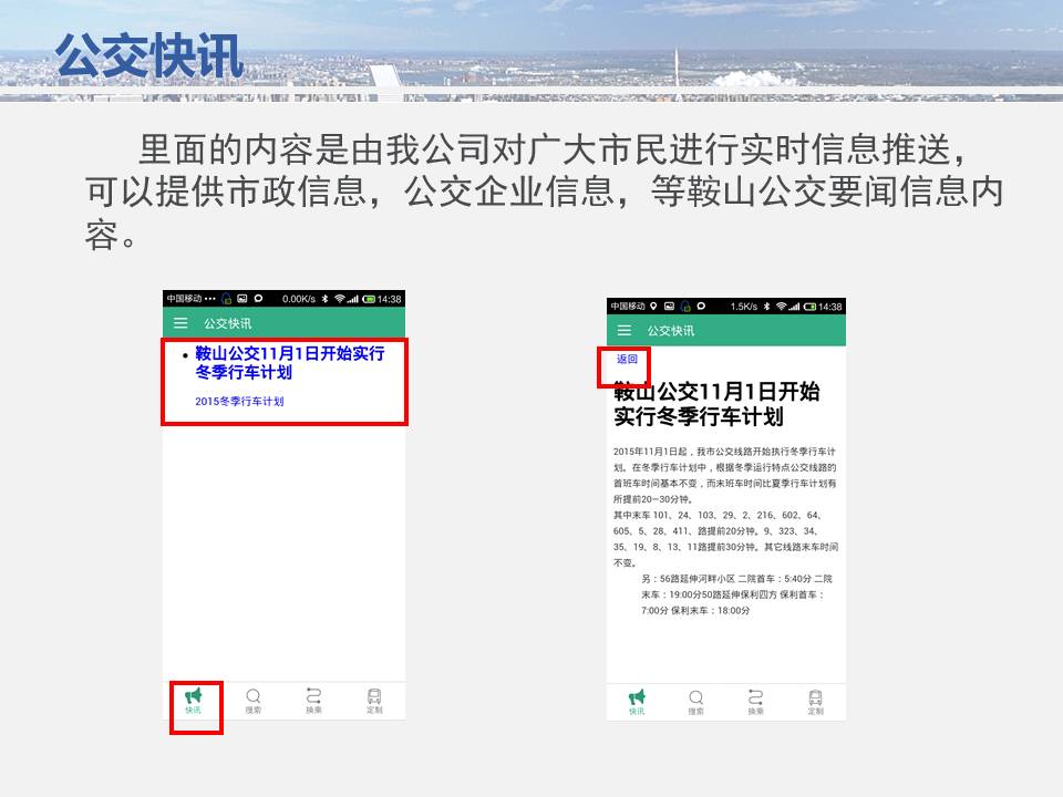 點點手機就可以看到公交車目前所在的位置,精準地掐好出門時間,從而避免在惡劣天氣或高峰期苦苦候車,工作人員坐在調(diào)度室內(nèi)就能掌握車輛在路上的運行情況……為方便廣大市民出行,基于安卓平臺開發(fā)的“鞍山掌上公交”官方APP將于11月15日正式上線試運行,適用于蘋果IOS系統(tǒng)的APP將于明年初上線,市民可在公共交通總公司官網(wǎng)下載該軟件,并實現(xiàn)37條公交線路車輛實時查詢的便利服務(wù)。